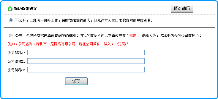 2)在打開的頁面中,選擇 公開,允許所有招聘單位查閱我的資料;但我的簡歷不向以下單位開放( 提示: 請輸入公司名稱中包含的公司簡稱 ):按下圖所示,對號入座填入信息,點擊保存按鈕即可.